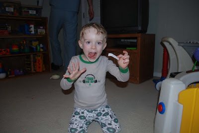 8:15 pm The boys follow me upstairs and start their evening race to get their pajamas on first. Caleb strips quickly and puts his Pull-up and PJ pants on by himself while I'm still helping Ethan out of his clothes. Caleb chants happily "I'm gonna be the winner! I'm gonna be the winner!" Ethan doesn't care about winning tonight, and keeps running away from me while I try to get his pajamas his on. Caleb gets to brush his teeth first since he was the winner, which Ethan protests loudly. After both boys have clean teeth, clean hands, and have pottied, we head back to their room for books, songs, prayers and tucking in. Bedtime goes very smoothly from here, and I kiss them goodnight right at 9:00 pm.